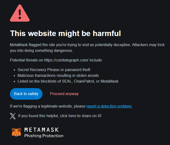 No official explanation has been released by Cointelegraph, but the optics are damaging. As a platform that positions itself at the intersection of crypto media and Web3 infrastructure, being flagged by MetaMask undermines both its credibility and technical trustworthiness.
